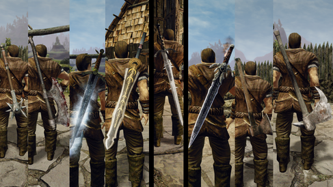 Zcela nové nebo přepracované modely pro desítky zbraní: sekery, meče, palice, buclíky, kladiva, rapíry a legendární kusy jako Srdce chladu, Křídlo Titána, Dominator, Dávný dvouruční meč a další.